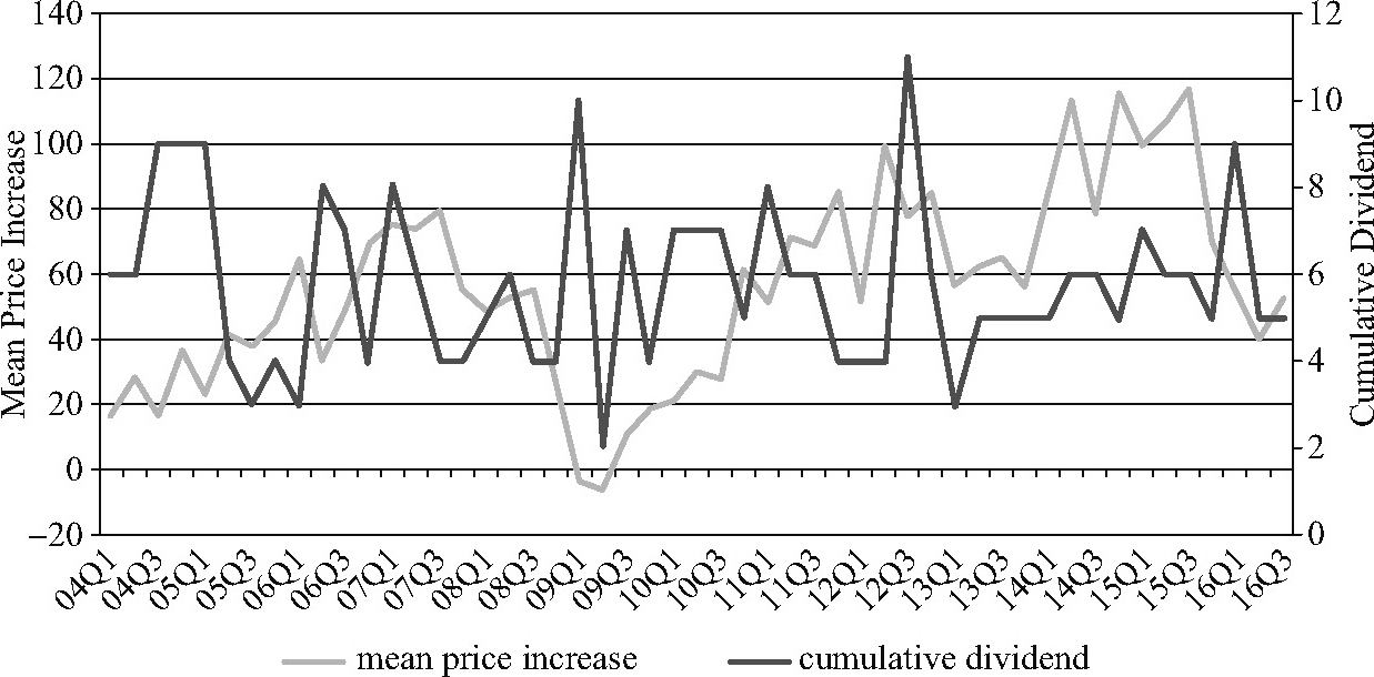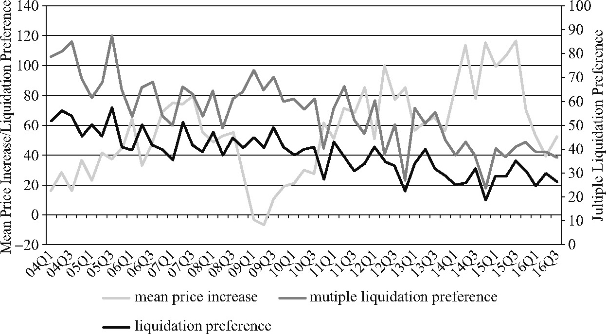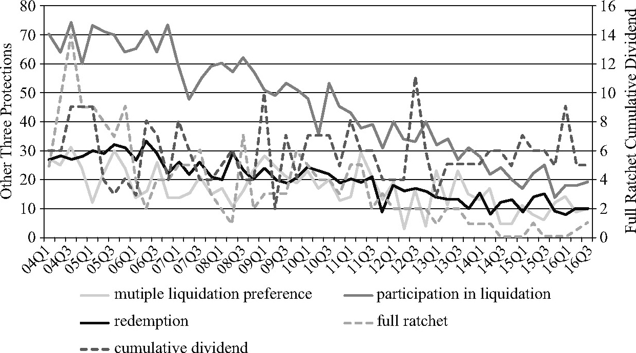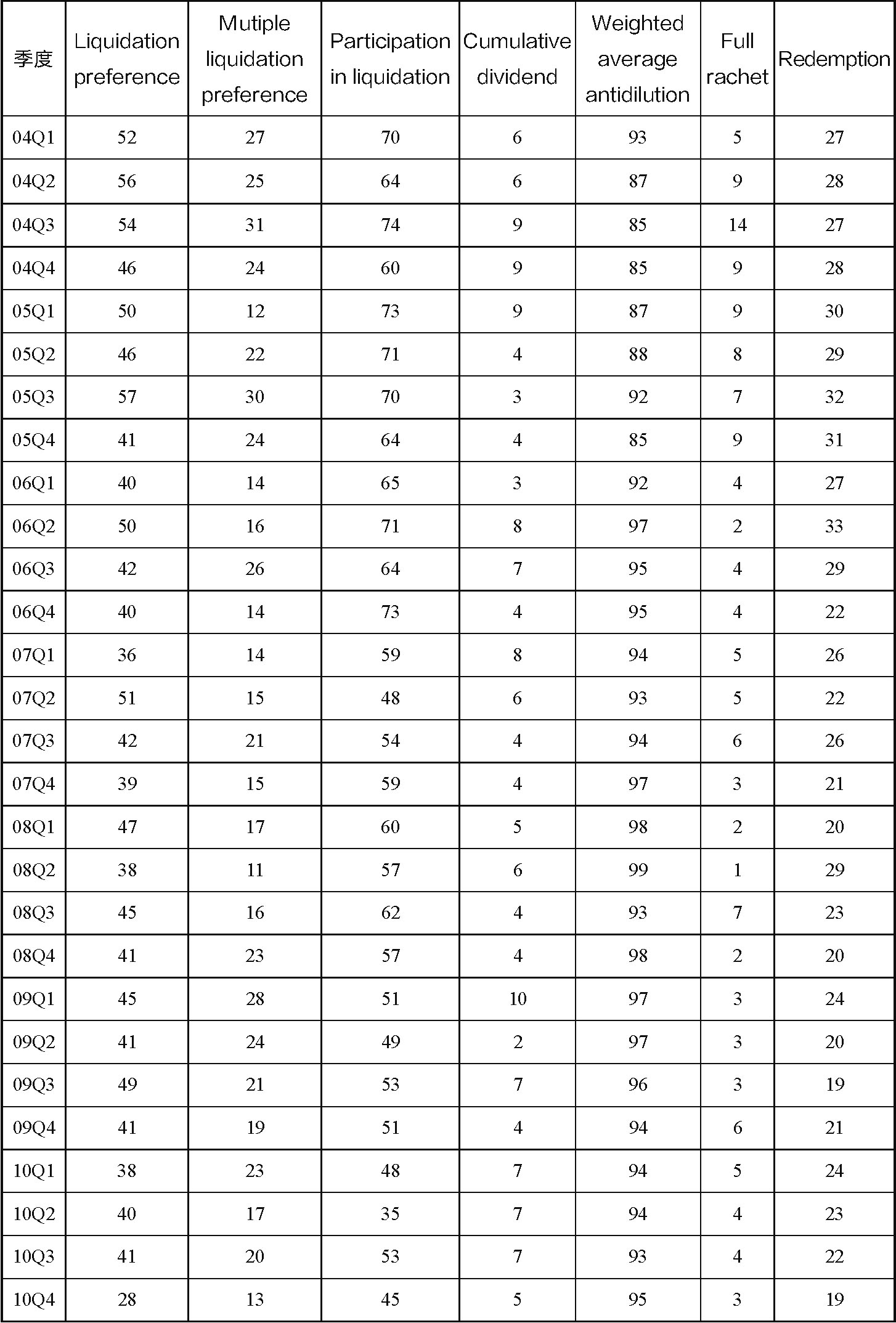 以上这一系列曲线图清晰显示了融资价格变化与VC协议中投资人保护条款使用频率变化的逆向关联关系。除了累积股息条款之外,其他的保护投资人条款都伴随融资价格的上扬而趋于鲜见,而又随着融资价格的下跌而复兴。融资价格的高低实际上揭示了风投资金的充沛程度,所以,也可以说在资金充沛的时期,偏向于投资人的协议条款自然减少,反过来也一样。因此,这种价格波动与投资人保护条款出现率的逆向关联性在金融危机期间(大约2008年第四季度到2010年第三季度)尤为明显。尽管简单的图示不足以证明市场资金充裕度与投资人保护条款使用率之间的因果关系,但是两者的关联至少与资金供应影响协议条款的看法相吻合。
