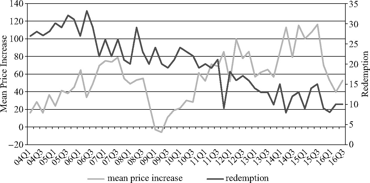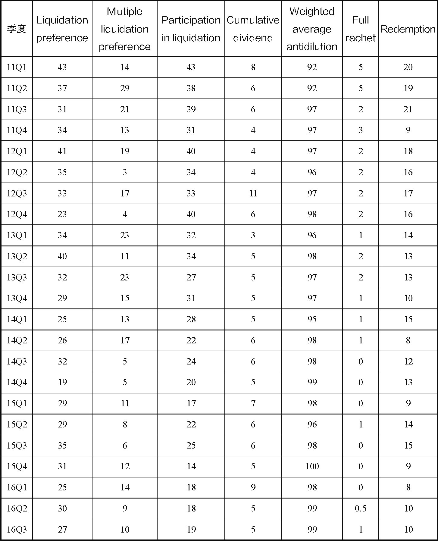 回赎权就是VC投资人享有的看跌期权(put option),它允许投资人在一定期限之后,要求创始人按约定的价格回购投资人的股份。这是投资人利用创始人的自有资金退出的方式,本章第一节提到它也许是与对赌最接近的一种硅谷VC投资协议典型条款。表1详细记录了自2004年第一季度至2016年第二季度以上各类条款在硅谷的使用频率。