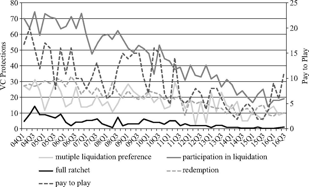 从上表可知,几乎所有保护VC投资人的条款使用频率总体都呈现下降趋势。以下图1概括展现了这一趋势。