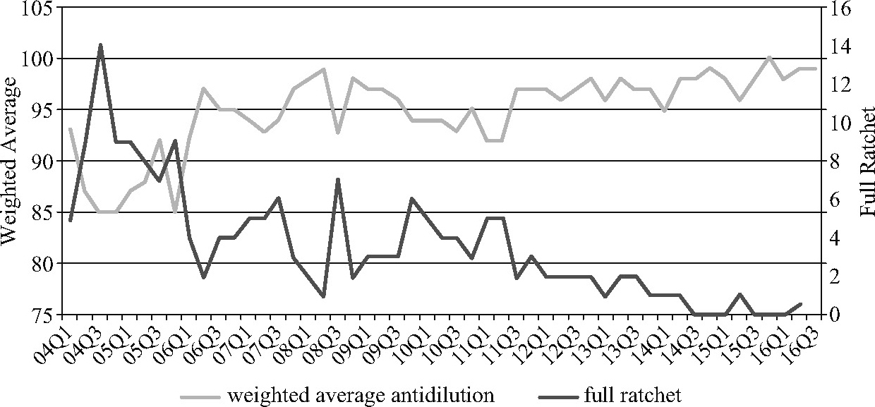 ,摊薄也会让VC投资人血本无归。有鉴于此,真正给予VC投资人特别保护的是完全棘轮这种特别的反摊薄条款。由于这两种反摊薄方式有此无彼的替代性,我们很容易理解伴随完全棘轮条款出现频率的下降,加权平均反摊薄的使用将随之上升,图2正表明了这一趋势。