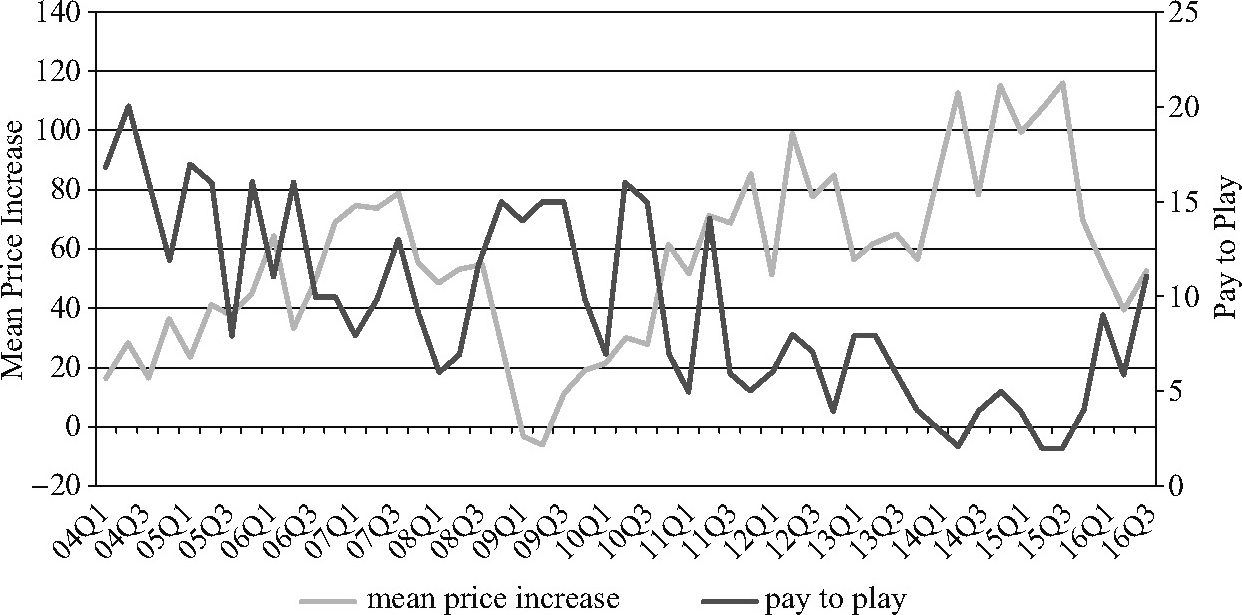对此,或许可以有多种解释。第一种解释是“购票上车”主要用于应对波及市场整体的系统性风险,因而随着市场资金的富裕,该条款的必要性降低,反之亦然。从这个角度看,正如前面提到的,硅谷投资协议条款根据具体的市场情势,始终保持一定的均衡状态。第二种解释是“购票上车”条款对VC投资人的保护作用也十分突出,因而出现与其他投资人保护条款类似的使用频率变化趋势。最后,还有一种解释是因为Fenwick的报告未将功能类似的“拔高”条款计算在内,因此低估了“购票上车”的实际使用率。