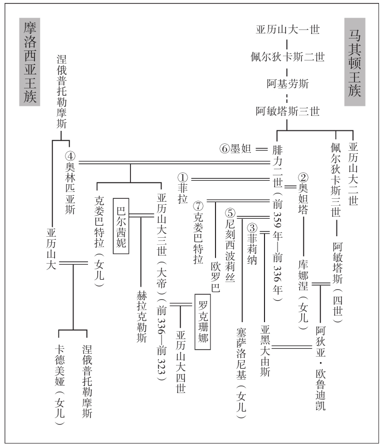 亚历山大的族谱 (①—⑦是结婚的顺序)