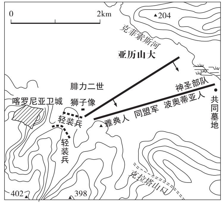 十八岁的亚历山大第一次参加正规军队的战斗,就被分配了重任——指挥马其顿军队的精锐骑兵,从中可以看出腓力二世对儿子的信赖。希腊联军中,雅典军在左翼对阵腓力二世,中央是同盟各国的部队,以底比斯为中心的波奥蒂亚军在右翼与亚历山大对阵。包含轻装兵在内,总兵力为三万六千四百。特别是最右翼,为底比斯军中最强的神圣部队。这支三百人的精锐部队自公元前378年创立四十年以来,未曾有过败绩。
