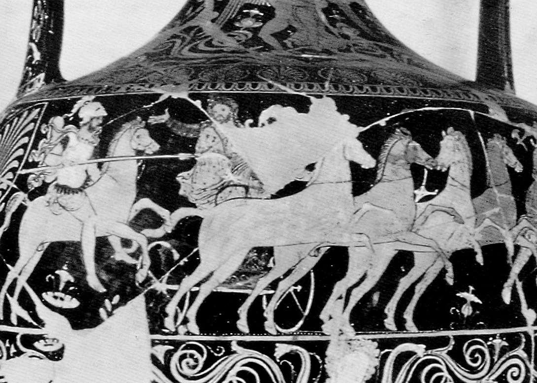 陶壶上绘有追击大流士的亚历山大 左为骑马的亚历山大,中间是乘马车逃走的大流士。那不勒斯考古学博物馆藏,出自 Faces of Power