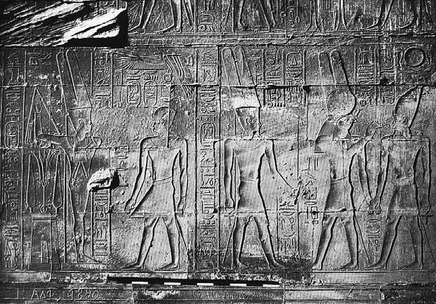 在卢克索阿蒙神殿中所绘的亚历山大图像 亚历山大(右)在蒙图神的指引下,走向阿蒙神的身边;下一场景中,亚历山大立于阿蒙神(左)面前。出自Stewart, Faces of Power