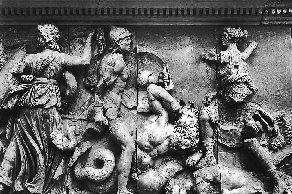 帕加马王国的宙斯大祭坛 众神与巨人族的战斗。女神阿耳忒弥斯与巨人奥托斯的浮雕。帕加马博物馆藏