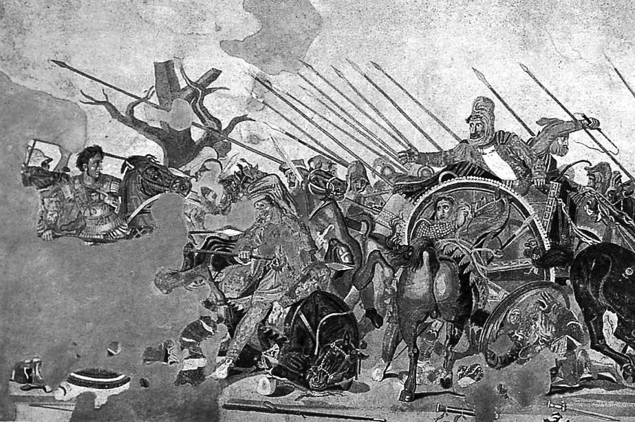 亚历山大镶嵌画 骑马的亚历山大和乘坐战车的大流士三世。那不勒斯考古学博物馆藏
