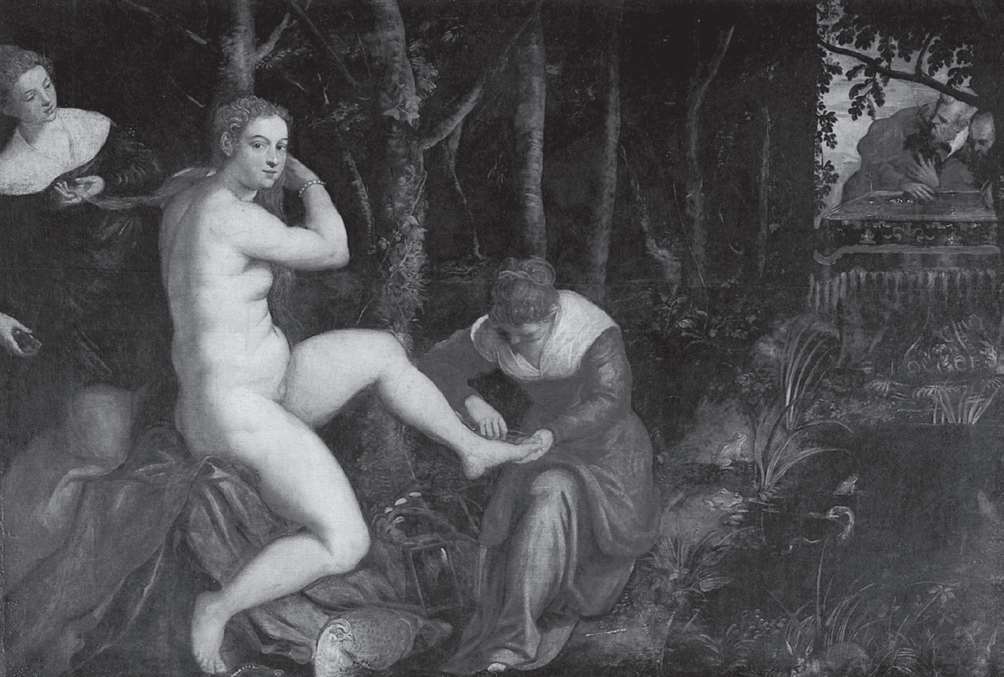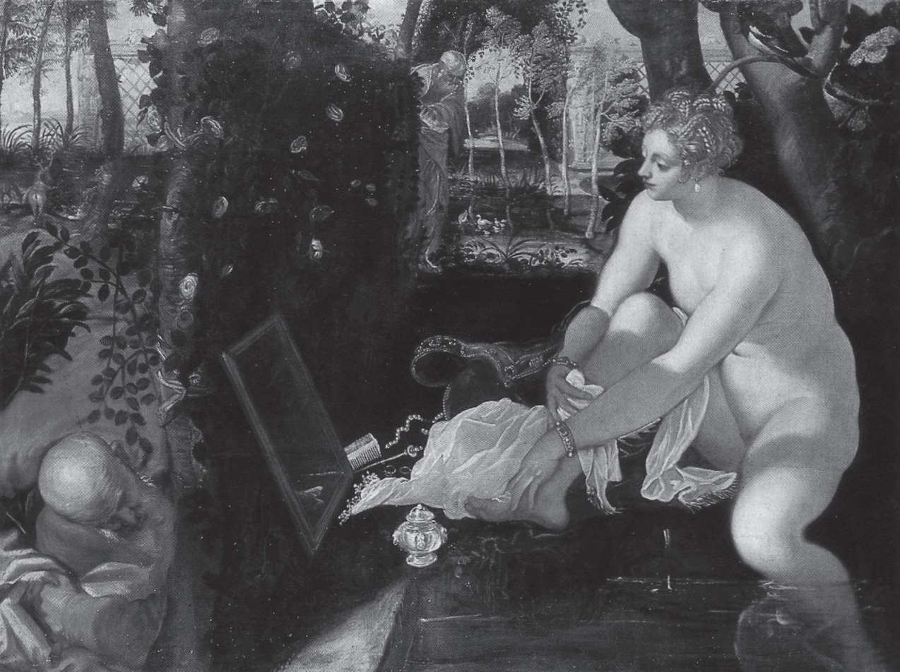 在丁托列托以同样主题创作的另一幅画中,苏珊娜正瞧着镜中的自己。这样,她自己也加入了观赏者的行列。