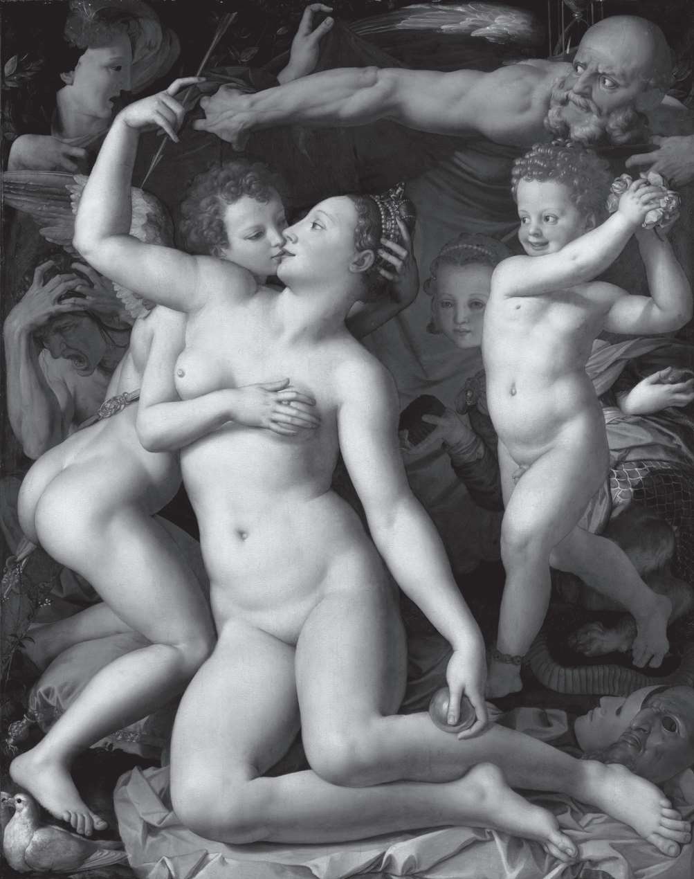 仔细察看布龙齐诺(Bronzino)的这幅关于时间和爱情的寓言。现在我们不必操心画中复杂的象征主义,因为那不影响作品有关性的诉求。别的姑且不论,这显然是一幅挑逗性爱的作品。
