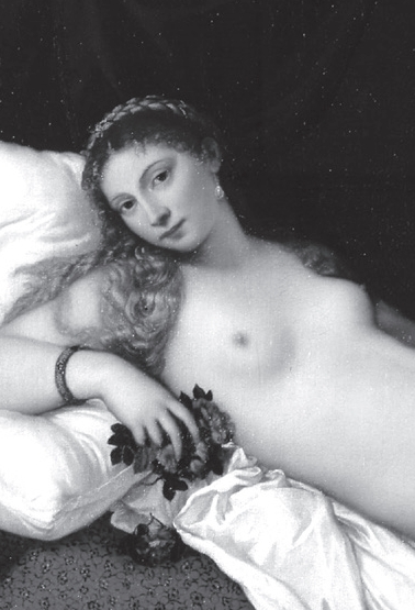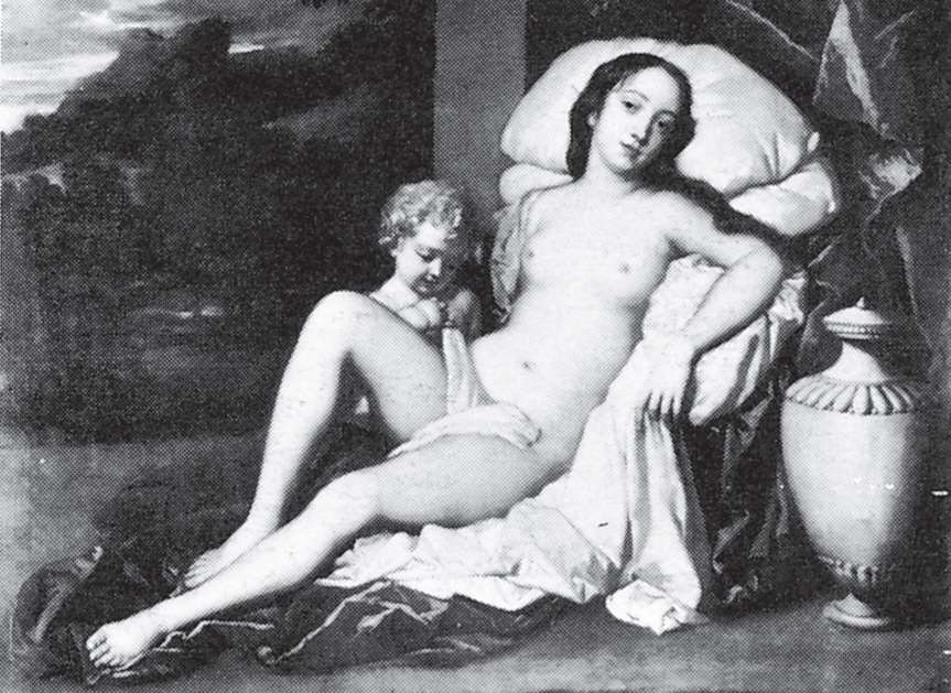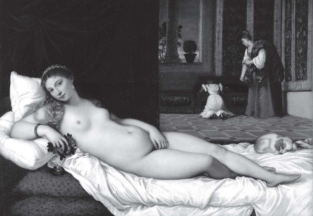 这幅画是佛罗伦萨大公(Grand Duke of Florence)送给法国国王的礼物。跪在软垫上亲吻那位女子的是丘比特,女人是维纳斯。可是她的身体摆成这种姿势同他们的亲吻是风马牛不相及的。她身体的姿势,是摆给赏画的男人看的。为的是激起他的性欲,而同她的性欲毫不相干。(在这幅画与欧洲传统中,不描画女性体毛的习惯,与上例有异曲同工之妙。毛发涉及性能力与激情。唯有减弱女人的性激情,才能使观赏者感到他独占这种激情。)画中的女性用以满足他人的欲望,而她们自己则不能有任何非分之想。