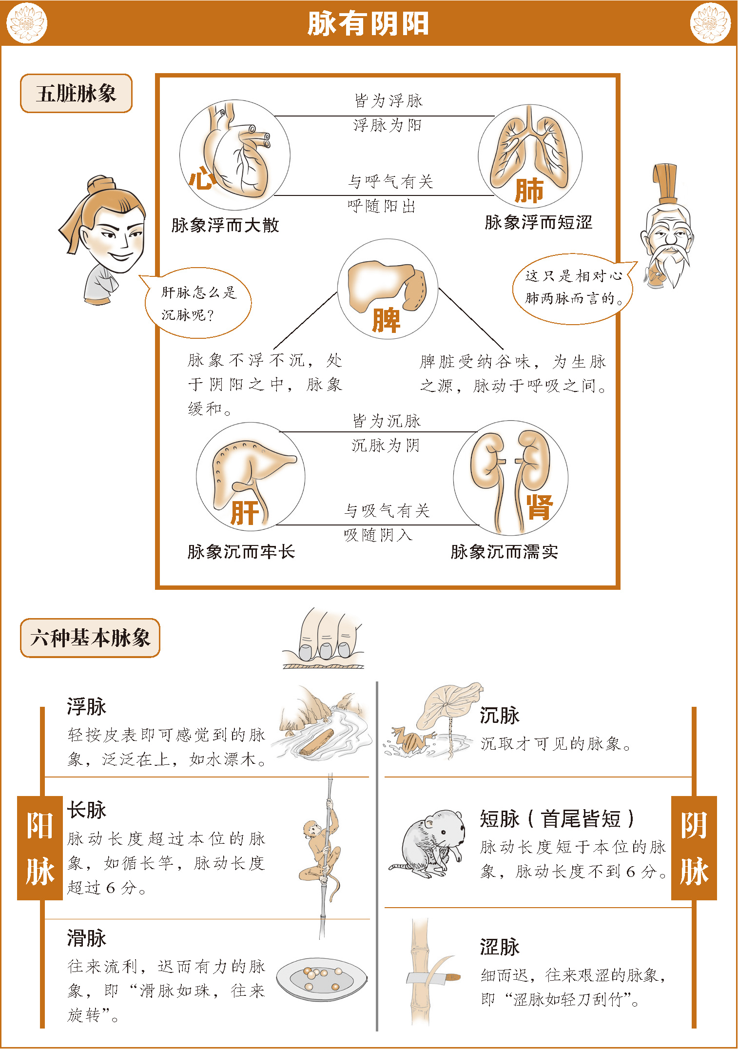 脉的搏动如果显得有力而紧绷,像按琴弦那样有弹性,就为弦脉。脉搏好像有点儿无力,像毛一样轻飘飘的,就为毛脉。脉搏来时有力,去时力量衰退,就为钩脉。脉搏无力,轻按不足,必须重按的,就为石脉。脉象和缓,阴阳之气流通平顺,就为滑脉。