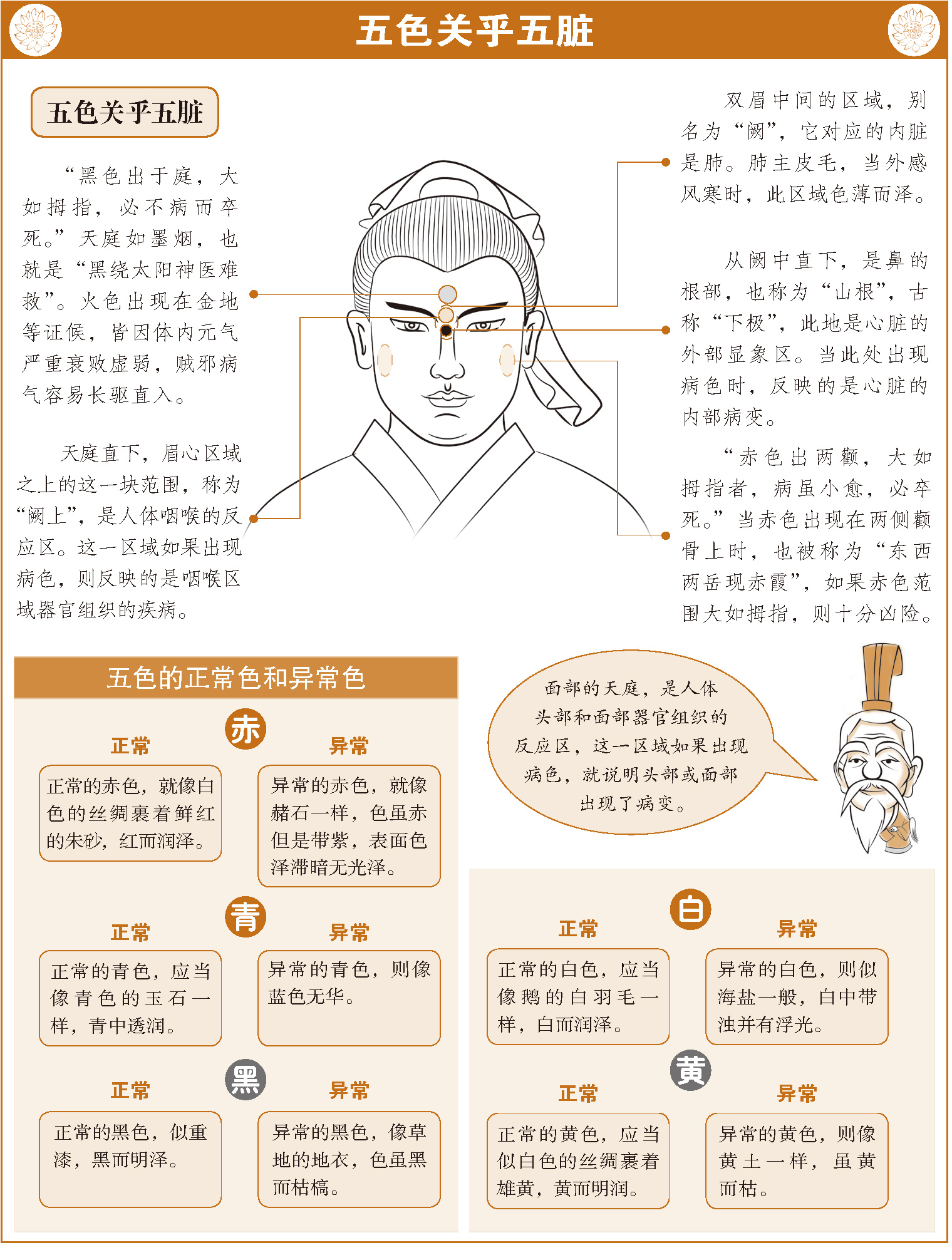 五脏的气色可以通过面部反映出来。五脏在脸上的气色,如果出现面色为青中有枯黑,面色为枳的黑黄色,面色为烟灰般的黑,面赤如凝血,面白如枯骨的,均是五脏之气败绝的反映,都是死亡的征兆。