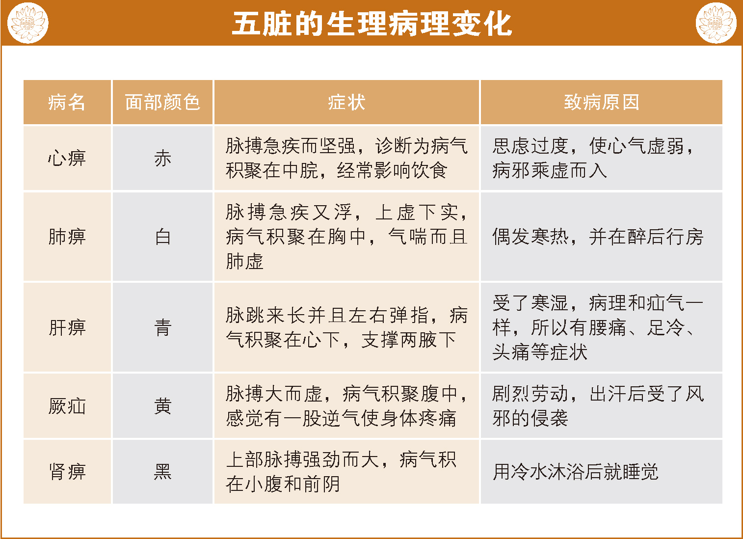 脉搏的大小、滑涩浮沉等表象,可以凭医生的手指来区分。五脏的生理病理变化表现,可以依此类推。了解五脏的形象和五音,可以体会到很多。五色虽然精微,可以用眼睛来观察。在诊断中如果能做到把气色与脉搏综合起来分析,那么对于疾病的处理,准确度就会很高。如果脸上现出赤色,脉搏急疾而坚强,诊断为病气积聚在中脘,经常影响饮食,这种病叫作“心痹”。它的致病原因,是思虑过度,使心气虚弱,病邪乘虚而入。如果脸上出现白色,同时脉搏急疾而浮,上虚下实,这时病气积聚在胸中,气喘而且肺虚,这种病叫作“肺痹”,致病的原因,是偶发寒热,并在醉后行房。如果脸上出现青色,脉跳来长并且左右弹指,这时病气积聚在心下,支撑两腋下,这种病叫作“肝痹”,致病原因是受了寒湿,病理和疝气一样,所以有腰痛、足冷、头痛等症状。如果脸上出现黄色,同时脉搏大而虚,这时病气积聚腹中,感觉有一股逆气使身体疼痛,这种病叫作“厥疝”。女子同样有这种情况,致病原因是剧烈劳动,出汗后受了风邪的侵袭。如果脸上出现黑色,同时上部脉搏强劲而大,这时病气积在小腹和前阴,所以这种病叫作“肾痹”,这是用冷水沐浴后就睡觉引起的病。