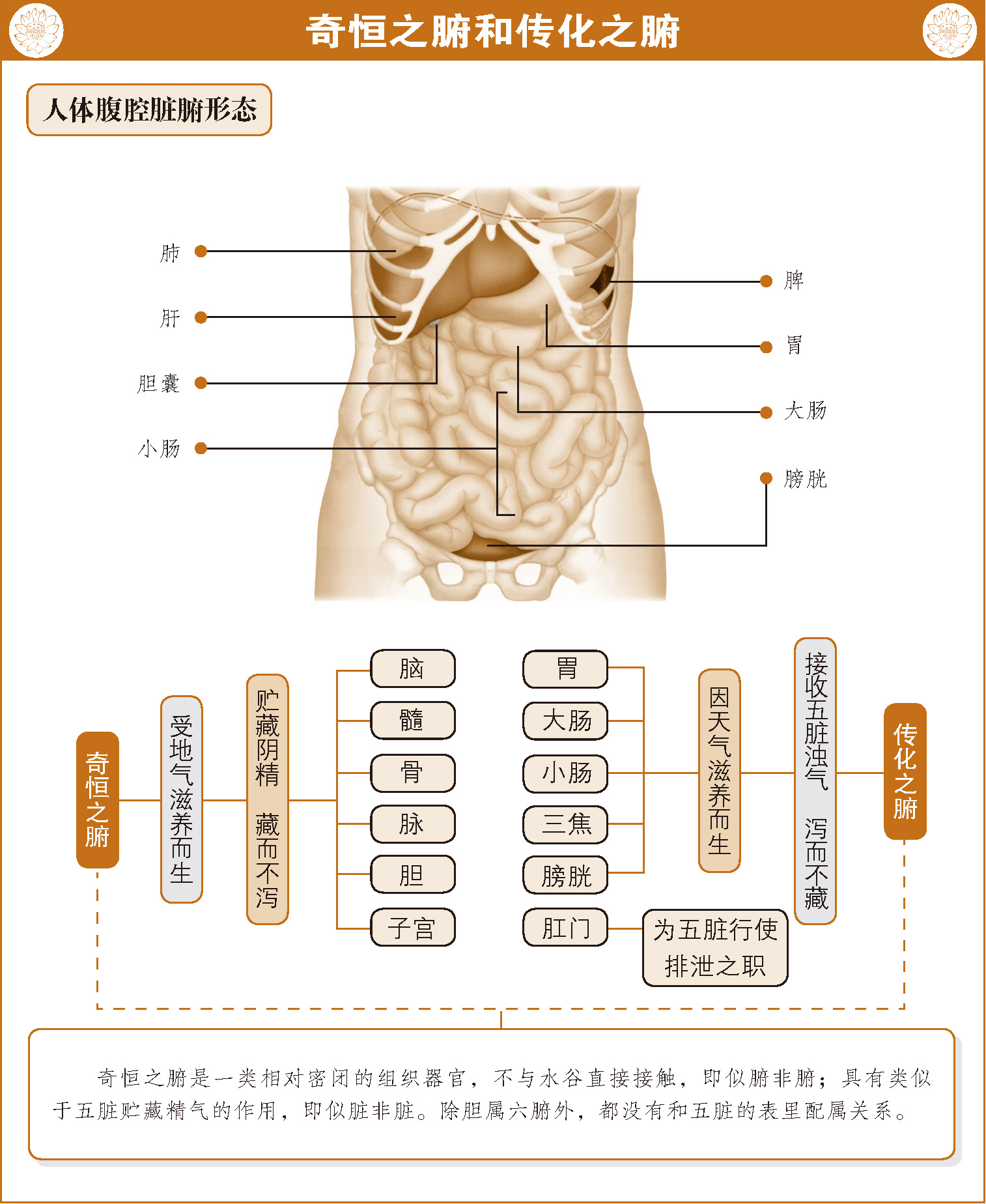 岐伯回答:脑、髓、骨、脉、胆和女子子宫,这六个器官,都是受地气滋养而生的,都能够贮藏阴精,和大地一样能够藏化万物,所以具备藏而不泻的功能,因此称为“奇恒之腑”。胃、大肠、小肠、三焦、膀胱,这五种器官,都是因天气的滋养而生的,如同天一样,所以是泻而不藏的,它们接收五脏的浊气,因此称为“传化之腑”。它们接收了水和粮食的浊气之后,不会久留,必须运送排泄出去。肛门就为五脏行使这种排泄之职,以便水和粮食的浊气尽快排出人体。我们所说的五脏,是贮藏精气而不排泄的,因其总是充满精气,而不像肠胃那样接收水谷。所谓六腑,其作用是要把食物消化、吸收、运送出去,所以虽然常常有水谷充实,却不能像五脏那样一直处于精气充满状态。因而食物入口以后,胃虽然饱胀,肠子却是空的,等到食物下去,肠中就会充实,而胃又空了,所以说六腑“实而不满”,五脏“满而不实”。