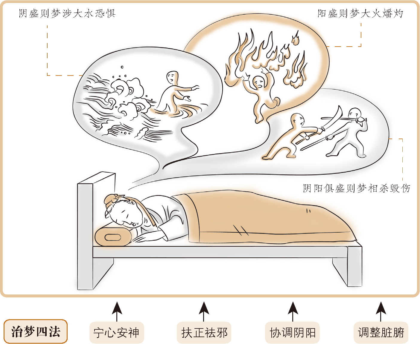 除了分析脉象要区分阴阳外,即使夜间做梦,也能够反映出体内阴阳的盛衰。阴气盛,就可能会梦见要渡过大水而害怕;阳气盛,就会梦见大火燃烧的场面;阴气阳气都旺盛,就会梦见互相残杀的情景;上部气盛,就会梦见飞腾;下部气盛,就会梦见向下坠落;吃得过饱,就会梦见送东西给别人;处于饥饿状态,就会梦见抓取食物;肝气盛,就会梦见自己发怒;肺气盛,就会梦见自己哭泣;腹中蛲虫多,就会梦见众人聚集;腹中蛔虫多,就会梦见与人打架受伤。