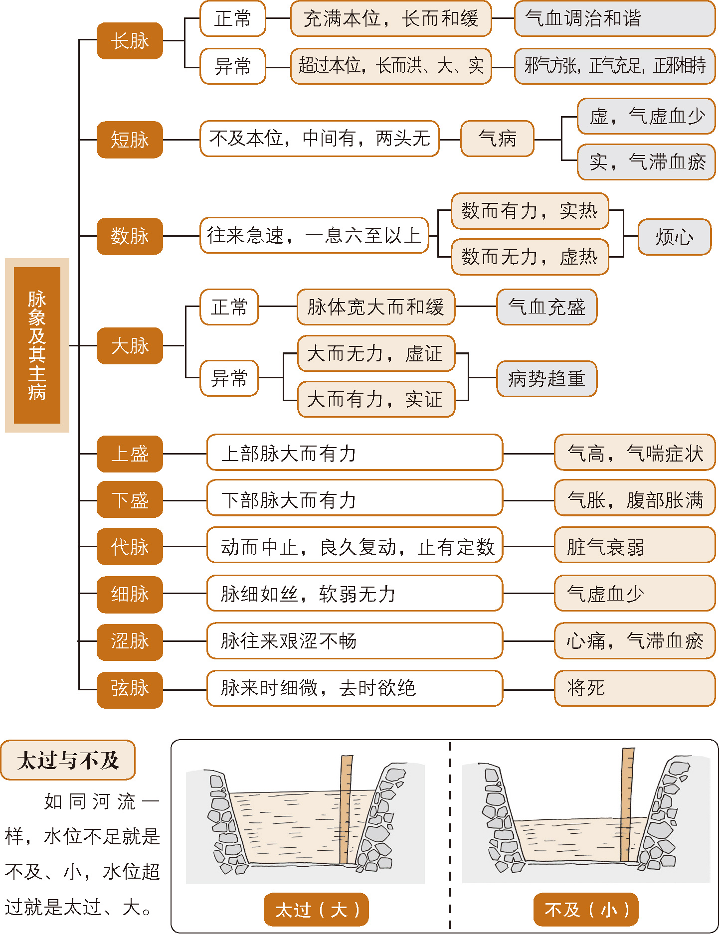脉是血液归聚的府库,血在脉中循环流动,取决于脉气的推动。脉长说明气分调治和谐,脉短说明气分有病,脉快说明病烦心,脉大则表示病势更严重了。上部脉盛,是气逆于上,出现气喘的症状;下部脉盛,是气胀于下,出现腹部胀满的症状。代脉是气衰;脉细小的是气少;脉涩滞的是病心痛;脉混乱,势如涌泉的,是病势加重、形色败坏,到了危险地步;若脉来的时候似有似无,离开的时候像弓弦断绝,必死无疑。