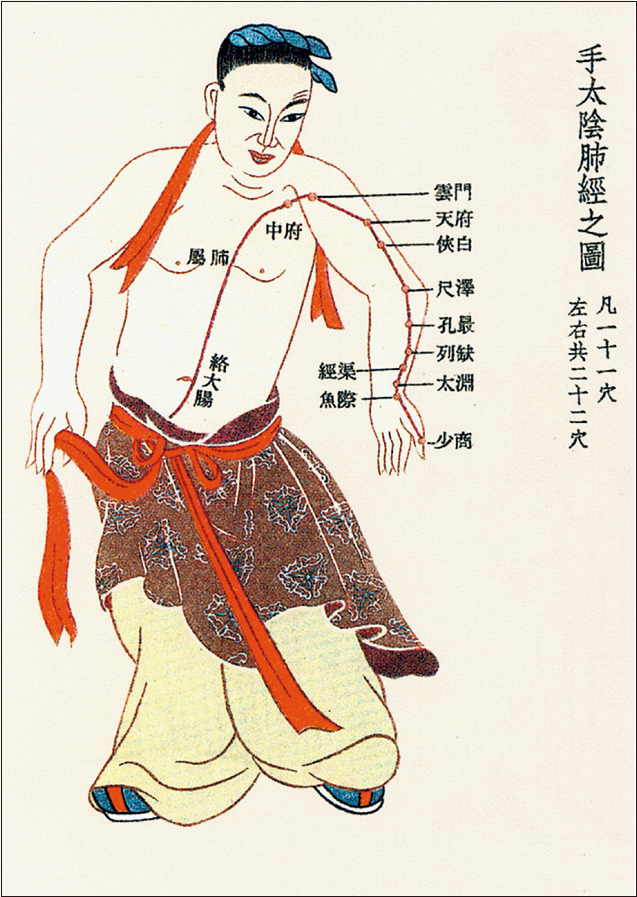 手太阴肺经在体内属肺,络大肠,并与胃、喉相连。在体表起于胸部,先下行至腹部,再上行至颈部,最后下行止于拇指端的少商穴。