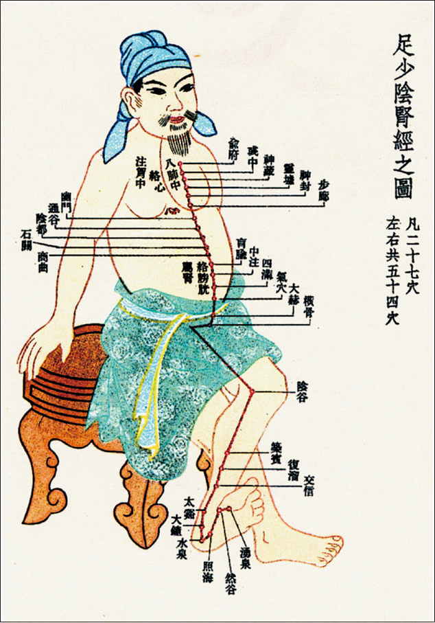 足少阴肾经在体内属肾,络膀胱,并与脊髓、肝、膈膜、喉、舌根、肺、心、胸腔等相连。在体表从小趾开始,沿下肢内侧上行,经腹部,止于胸部。