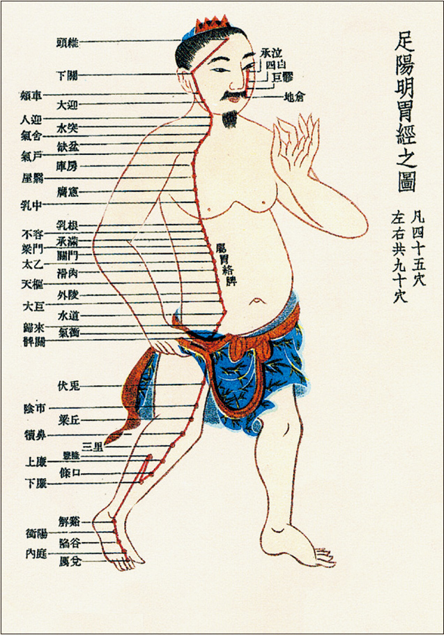 足阳明胃经在体内属胃,络脾。在体表起于迎香穴,下行,最后止于第二趾端。