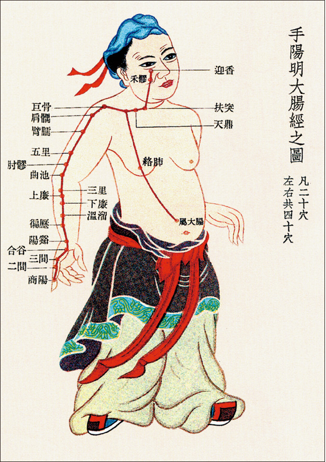 手阳明大肠经在体内属大肠,络肺。在体表由食指端的商阳穴开始,上行至面部,止于对侧鼻子旁边的迎香穴。