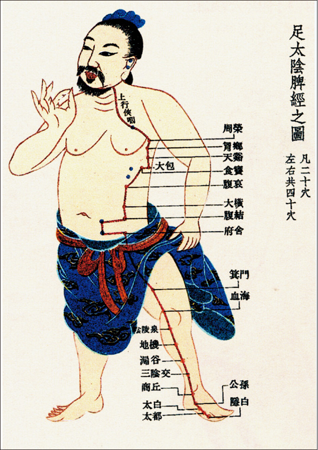 足太阴脾经在体内属脾,络胃,并与心及舌根相连。在体表起于大趾内侧的隐白穴,沿下肢内侧上行,经腹部、胸部,止于胸部侧面。