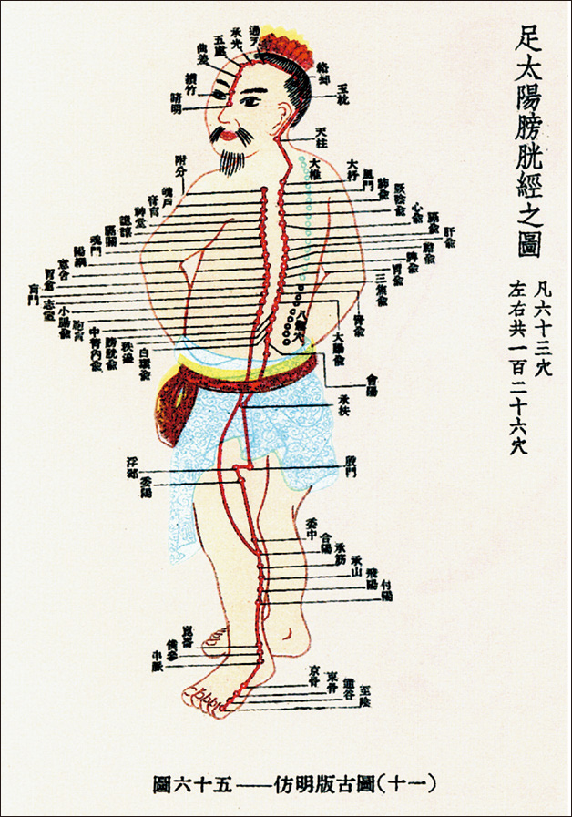 足太阳膀胱经在体内属膀胱,络肾,并与脑相连。在体表起于眼睛附近的睛明穴,向上越过头顶,然后在背部下行,最后止于小趾端。