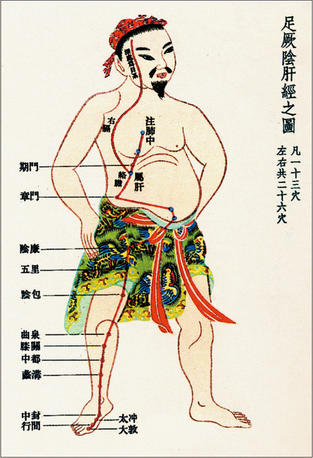 足厥阴肝经在体内属肝,络胆,并与生殖器、胃、横膈膜、咽喉、眼球等相连。在体表起于大趾,沿下肢内侧上行,经腹部,止于胸部侧面。