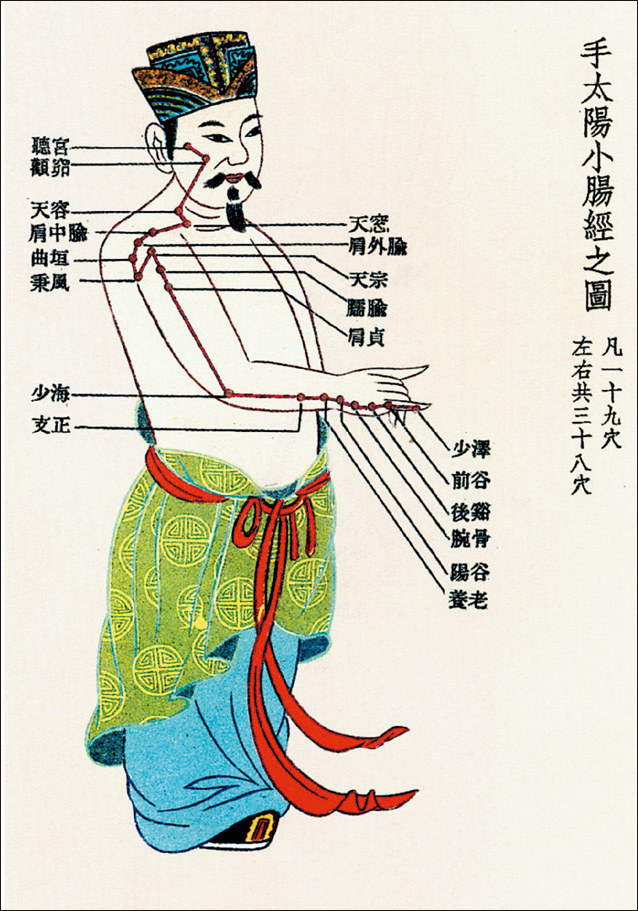 手太阳小肠经在体内属小肠,络心,并与胃、眼和内耳相连。在体表起于小指外侧的少泽穴,沿手臂外侧上行至肩部,再到面部,止于耳部。
