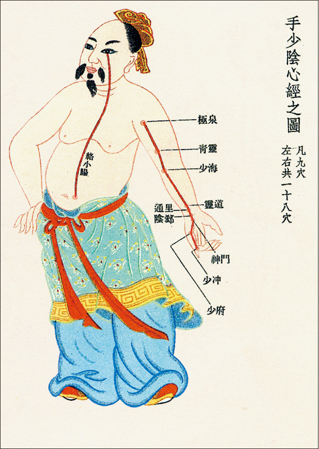 手少阴心经在体内属心,络小肠,并与咽部及眼相连。在体表从腋下极泉穴开始,沿手臂内侧下行,止于小指端。
