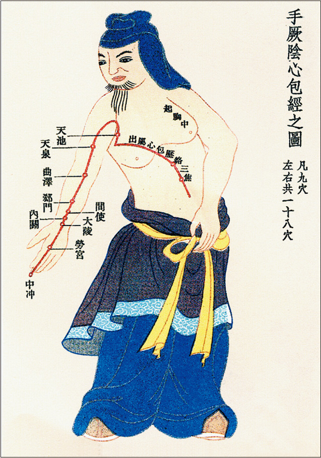手厥阴心包经在体内属心包络,络三焦,并与横膈膜相连。在体表起于胸部侧面,沿手臂内侧下行,止于中指指尖的中冲穴。