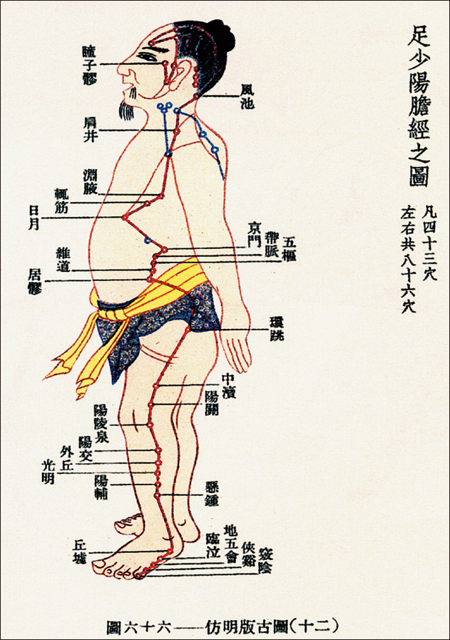足少阳胆经在体内属胆,络肝。在体表由眼部开始,经身体侧面下行,止于第四趾端。