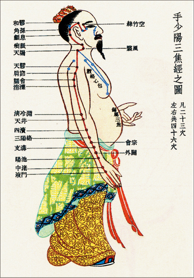 手少阳三焦经在体内属三焦,络心包,并与耳、眼相连。在体表起于无名指端的关冲穴,沿手臂外侧上行,经肩部、侧颈部到头部,止于眼部。