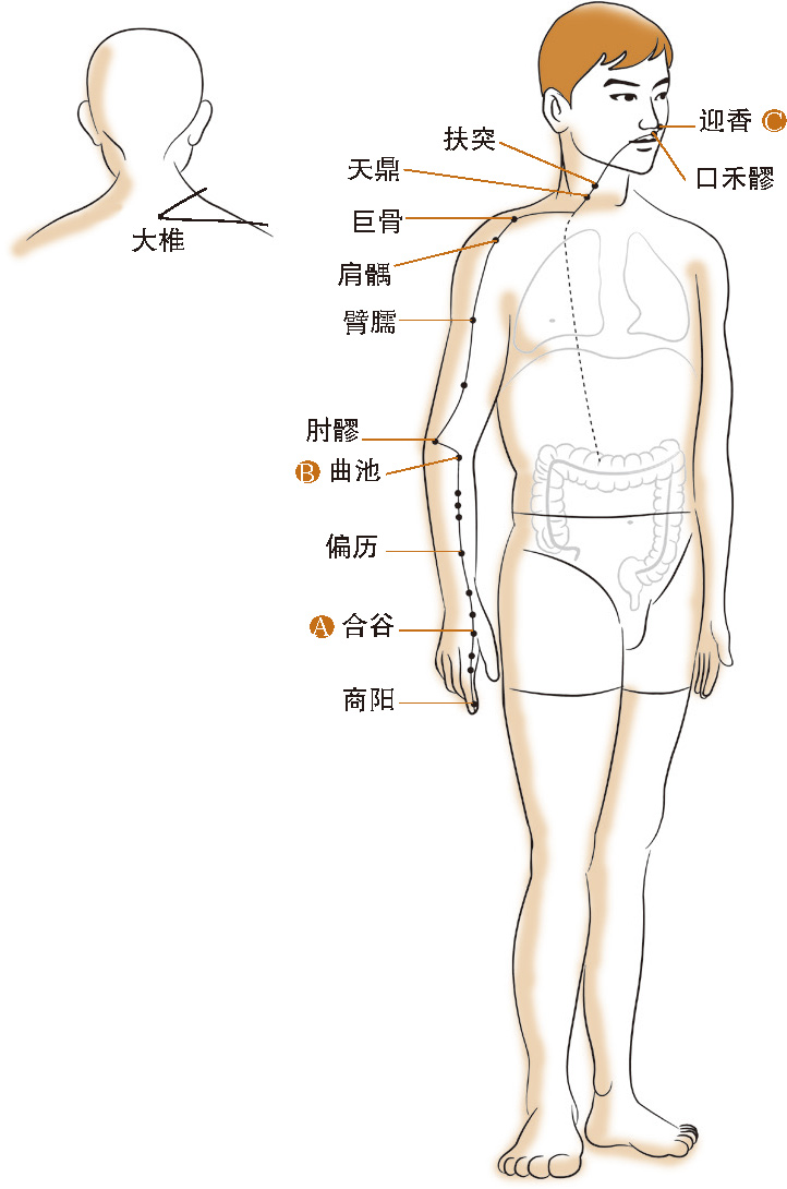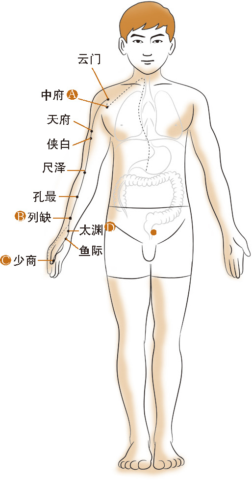 ● 列缺: 本穴可防治咽喉肿痛、口眼㖞斜、半身不遂、牙痛、咳嗽、气喘。