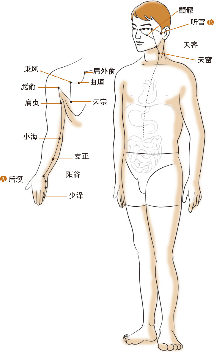 ● 听宫: 此穴宁神志、宣通耳窍,故对耳聋、耳鸣、中耳炎、牙痛、癫狂等有较好的防治作用。