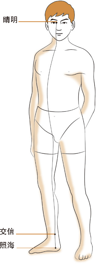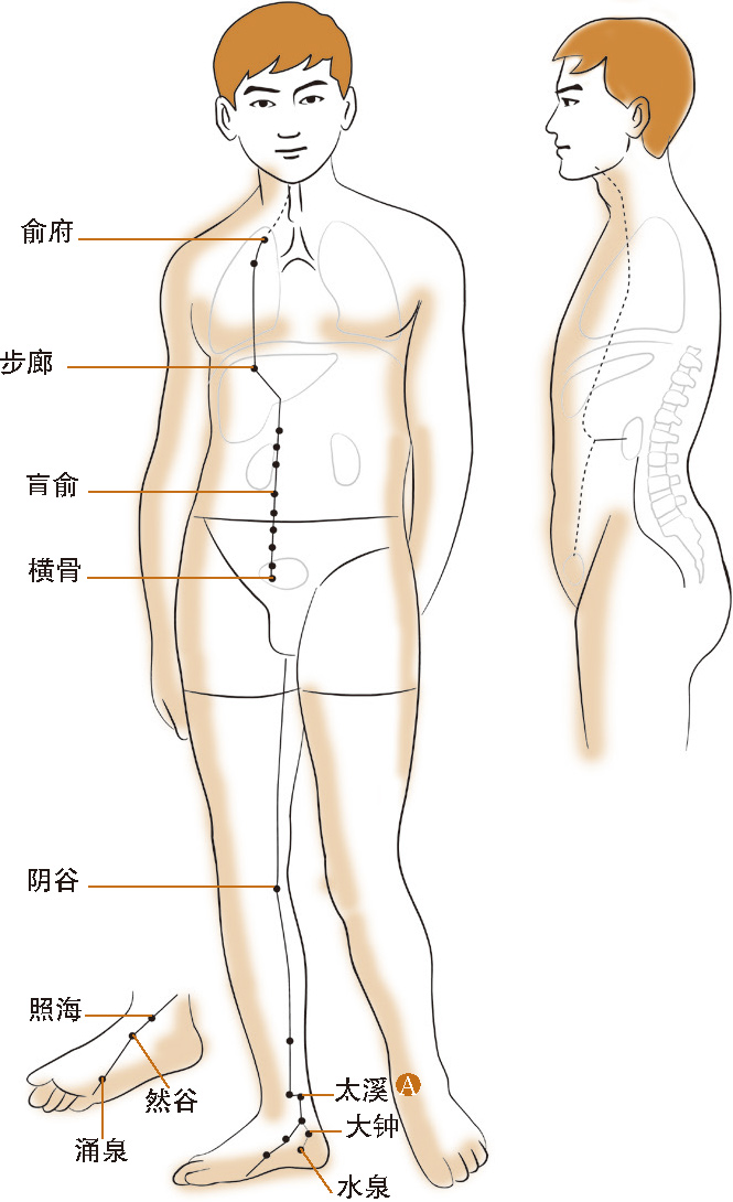 循 行: ①起于足舟骨的后方;②上行内踝的上面;③直上沿大腿内侧;④经过阴部;⑤向上沿胸部内侧;⑥进入锁骨上窝;⑦上经人迎的前面;⑧过颧部,到目内眦与足太阳经和阳跷脉相会合。
