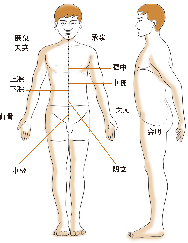 交会腧穴: 会阴、曲骨、中极、关元、阴交、下脘、中脘、上脘、天突、廉泉、承浆。