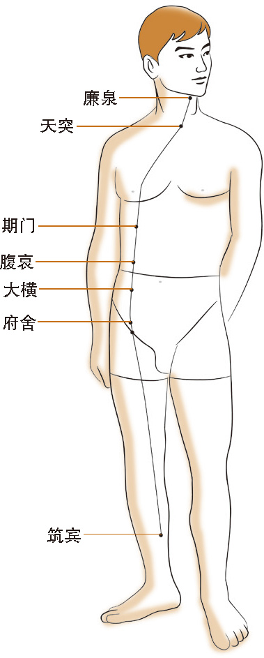 交会腧穴: 筑宾、府舍、大横、腹哀、期门、天突、廉泉。