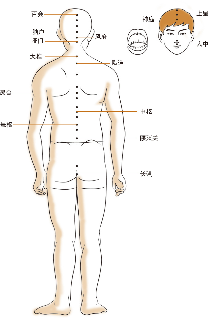 交会腧穴: 长强、陶道、大椎、哑门、风府、脑户、百会、神庭、人中。