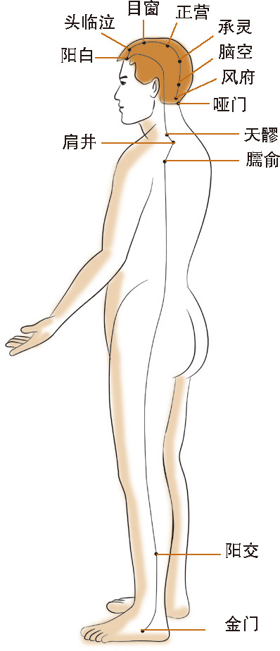 交会腧穴: 金门、阳交、臑俞、肩井、天髎、头维、本神、阳白、头临泣、目窗、正营、承灵、脑空、风池、风府、哑门。
