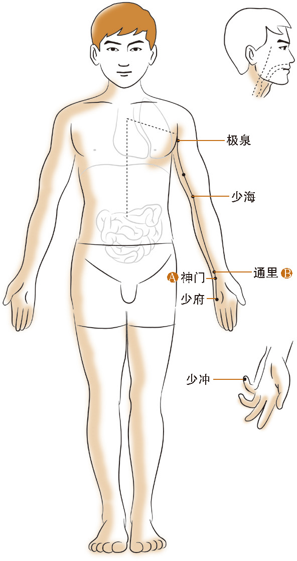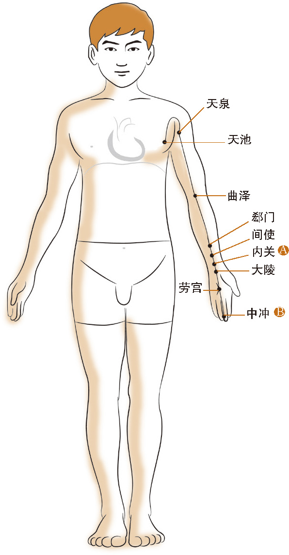 本穴能宁心安神、宽胸止痛,是心的常用保健穴,对心痛、心烦、惊悸、健忘、胸闷、梦遗、盗汗、癫狂有较好的防治作用。不宜深刺,可斜刺。