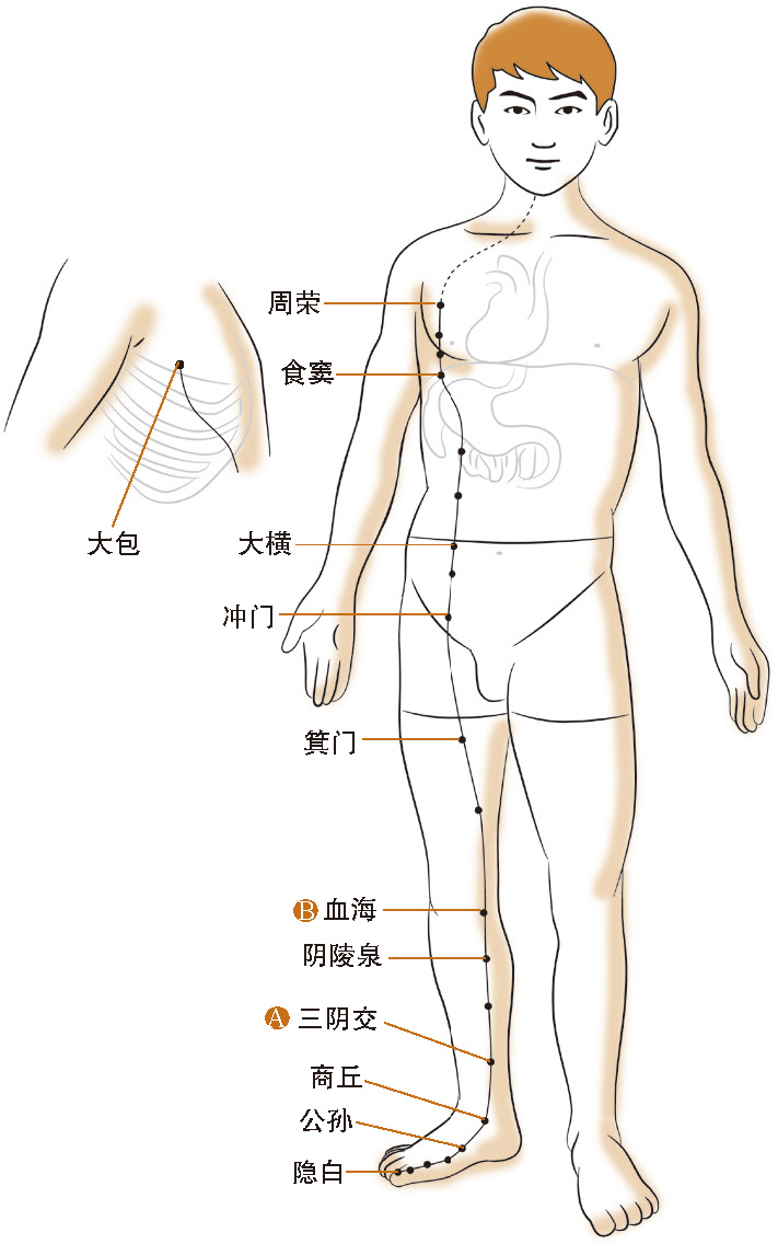 ● 三阴交: 本穴对增强腹腔诸脏器,特别是生殖系统的健康有重要作用,能防治肠鸣腹胀、泄泻、月经不调、带下、阳痿遗精、遗尿、失眠、疝气、不孕等。