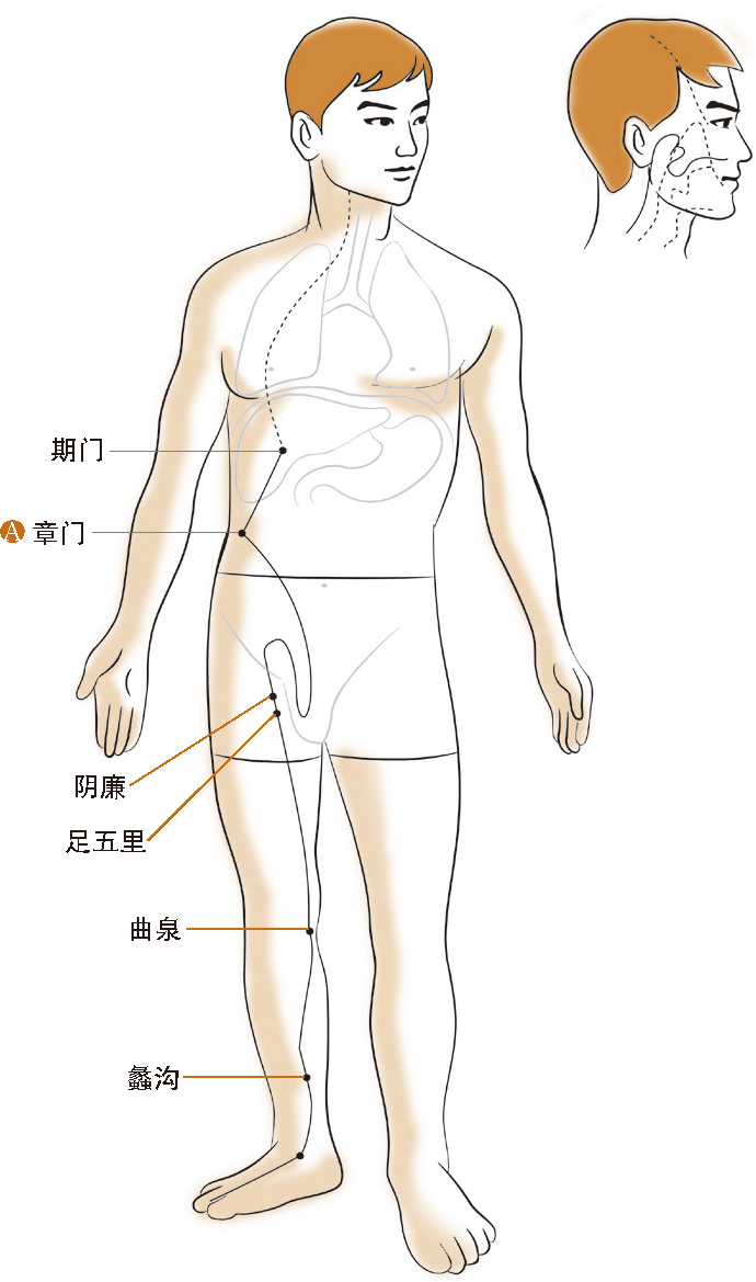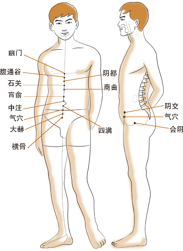 交会腧穴: 会阴、气冲、横骨、大赫、气穴、四满、中注、阴交、肓俞、商曲、石关、阴都、腹通谷、幽门。