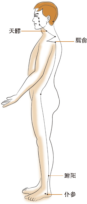 循 行: ①起于足跟外侧;②向上经过外踝;③沿足少阳经上行髋关节部;④经胁肋后侧;⑤从腋后上肩,至前额;⑥再到项后,合于督脉。