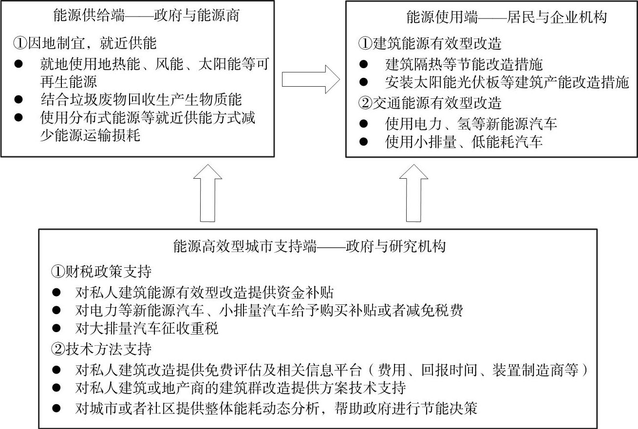 从整体战略层面上来看,能源高效型城镇战略以城市能源“供给—使用”路径流程为视角,从能源供给段、能源使用端、能源有效城市支持端三部分建立起实现城市能源合理、高效使用的整体行动指引(图3-1)。