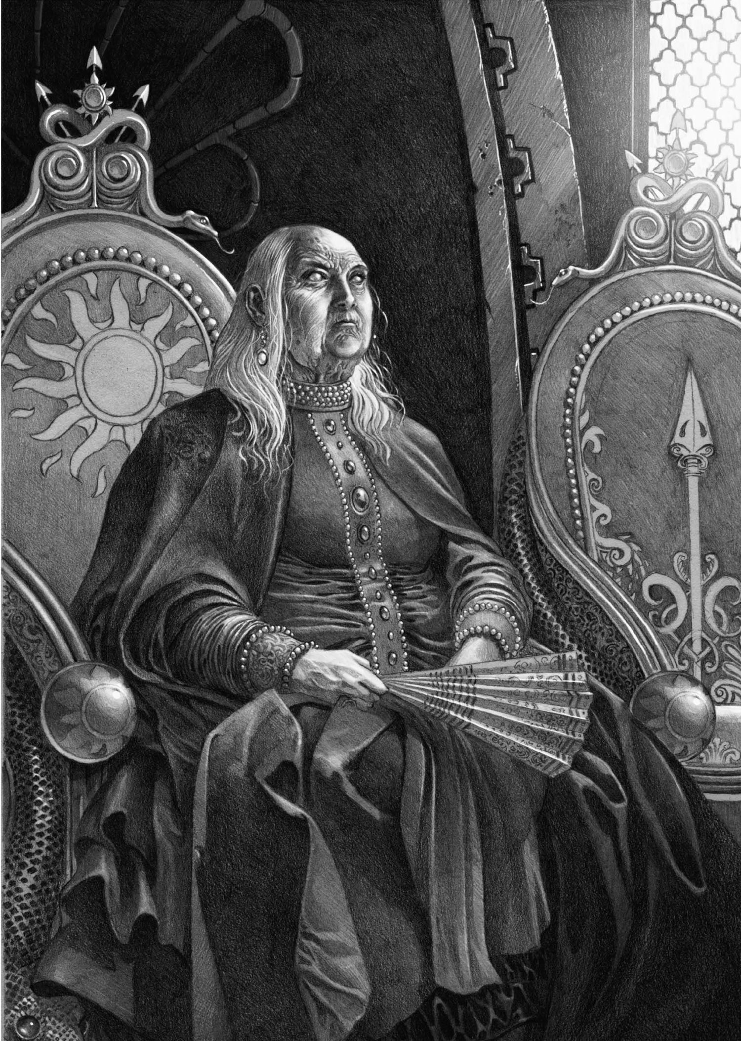 王后最终飞到马泰尔家族古老的家堡阳戟城,发现多恩公主在被抛弃的城堡里等她。学士们说,梅瑞拉·马泰尔当时已是八十高龄,统治多恩长达六十年。她眼睛瞎了,身体极端肥胖,且几乎秃顶,皮肤灰黄松垮。“骄傲的”亚尔吉拉称她为“多恩的黄蛤蟆”,但年龄和眼盲并未影响公主的头脑。
