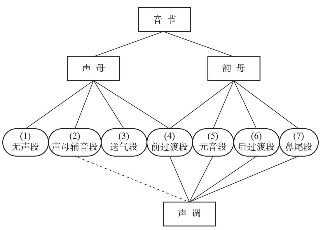 应该说明的是,这种模型中的音段,并不对应着语音学中的某一种公认的语音单位,它们只是从合成的需要出发,以普通话音节的声学特性为依据,人为地划分出来的。它既可比音位大,如一个元音段(5)中,可以包括三个音位组成的复合元音,也可以比音位小,如一个送气塞音须由模型中的无声段(1)、声母辅音段(2)、送气段(3)和前过渡段(4)组成。