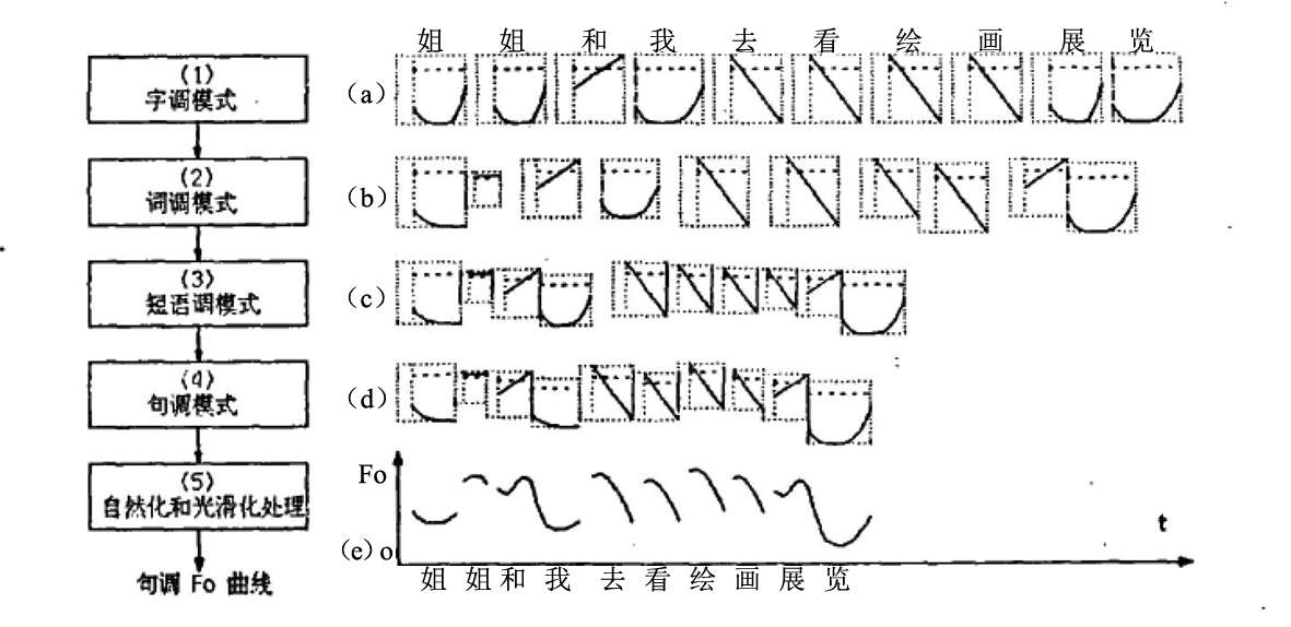 为了改善合成语句的自然度,人们进行过许多探索。例如,李子殷(1985)采用了15种双音节调型的基频曲线来合成双音节词。张家禄(1990)在其开发的系统中,借用了瑞典语的Lund语调生成模型,以手工方式为该模型中的参数附加语调标志后,再由模型生成出所需要的语调曲线。在四川大学的系统中,有6条调节能量的规则,有6条调节音节时长的规则,有3种停顿,6种声调模式(于鸿洋等,1990)。在台湾大学开发的“国语”语音合成系统中,有14种音节调型和8条变调规则、重音规则、语调规则、音节时长规则和能量调整规则(Leeet al,1989)。