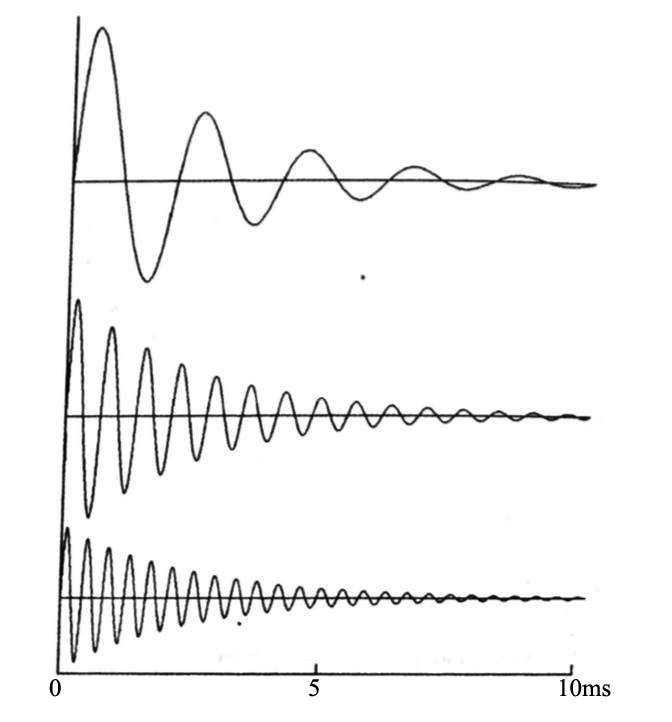 请看图8.1上面的波形。它像是在声道上轻拍了一下发出的,是一个振幅递减的波(随着时间变小)。你可以从图底部的时间轴上看到10毫秒内(即一秒的百分之一)有5个气压峰。相当于一秒里有500个峰值。换句话说,这是一个500 Hz的波,大约是元音[ə]的第一共振峰值。图中另外两个波有更高的频率——10毫秒中有更多的气压峰值。它们相当于1500和2500 Hz的波,即元音[ə]的第二和第三共振峰频率。如果声道中的空气振动源单一,会产生像图8.1中比较规则的音波。如果有很多振动源,如气流通过振动的声带,这些波形会重复产生,给这些陪音频率加上一个基音频率。