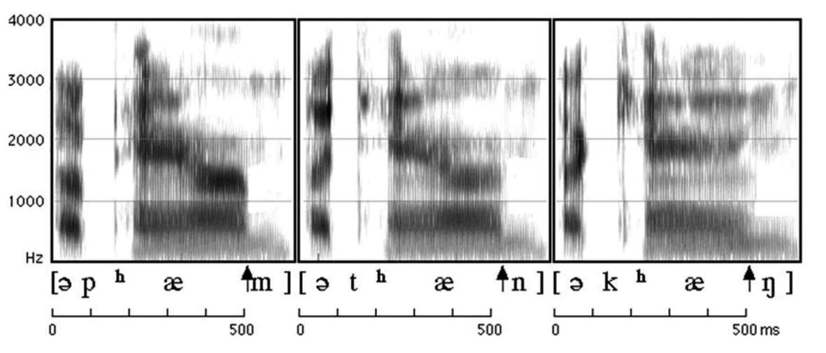 图8.8 aPam , atan , akang 的语图。箭头表示口腔鼻塞形成鼻辅音。