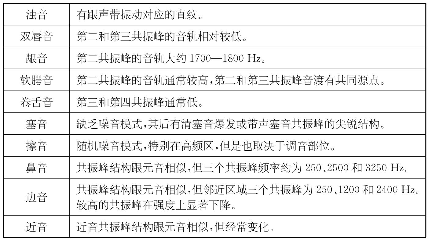 表8.1 辅音特征的声学关联。注意:这些描述应该视作只是一个粗略的指向。